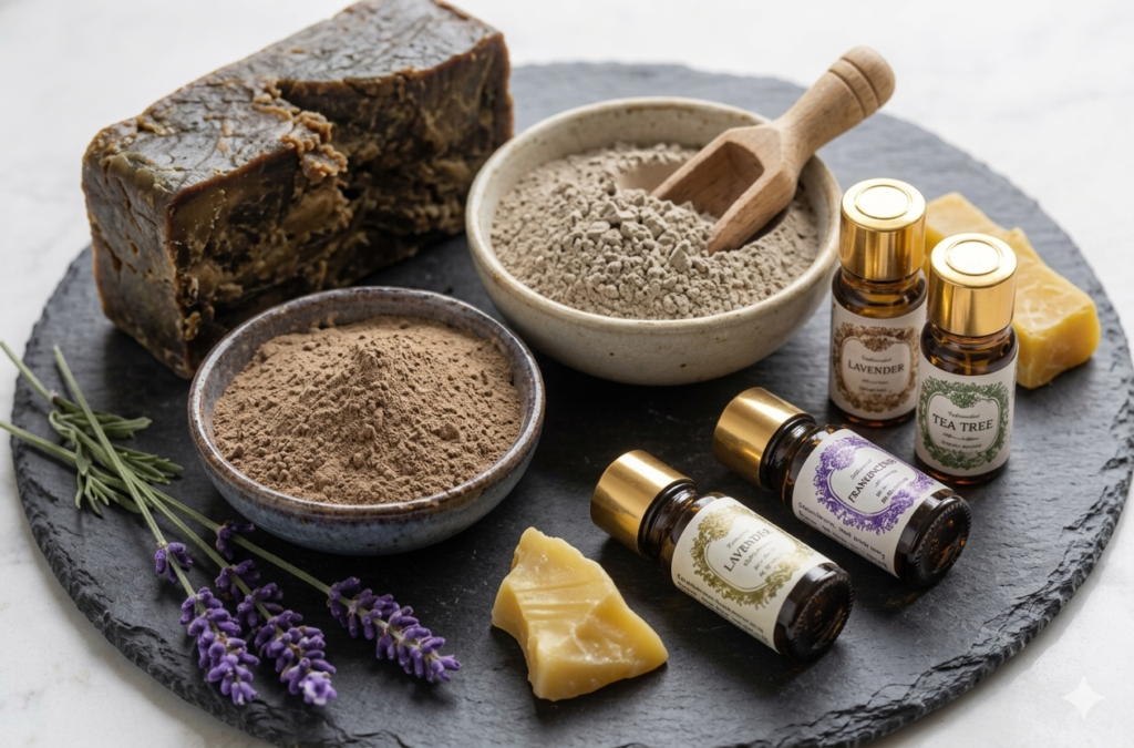 Nous utilisons exclusivement des ingrédients nobles et naturels : savon noir au chocolat, ghassoul aux sept plantes, eucalyptus et huiles essentielles précieuses pour respecter votre peau et votre santé.